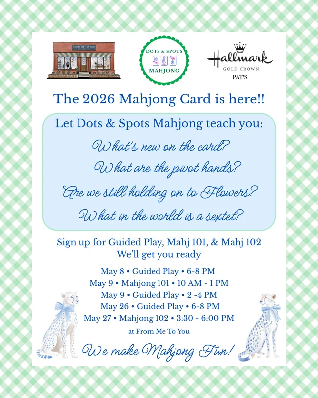 Saturday 5/9 - 10 AM - 1 PM We make Mahjong fun! Join us for Mahjong 101, a beginner group lesson designed to get you playing with confidence. All materials will be provided. You will learn tile recognition, how to read the card, game etiquette, and the flow of the game in a fun, relaxed environment. After this class, you will be ready to join one of our guided play events. Total cost $65.00, which includes the group lesson ($50.) and the official 2026 National Mah Jongg League playing card ($15). Seats are limited.